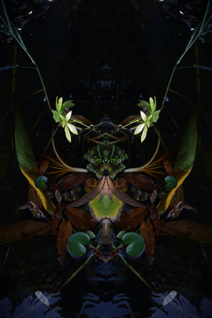 The final image reflects Lawson’s appreciation for the beauty of nature, but the manipulation veils another layer. Familiar images of flowers, trees and landscapes appear simply mirrored, but look closer and within the reflection, camouflaged in plain sight, you will see a face staring back at you. Is it a mythical creature or a primitive mask? An angel or a demon? Or is it nature itself passing judgement on its own destruction and exploitation by man. Whether the image is a celebration or subversion of its subject is open to interpretation. Like the ink blots in a Rorschach test, depending on your state of mind, it is up to you. Lawson simply asks the question: ‘What do you see?’…