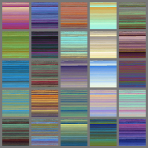 About: A series of highly visual designs by digital artist and programmer Robert Allison. "Generation Colour: Four initial colours are crossed with each other (and themselves) to produce ten more. This process is repeated, each expanding generation exposing underlying structure in finer detail. 25 results arranged on each piece." In Robert's work individual colours are defined as 'genetic sequences', realised digitally as a string of 1s and 0s. Each is a kind of 'creature', encoded by a binary DNA, but then expressed as the usual RGB or HSV colour-map values. Because of this representation, colours can be mutated and crossed with each other within the computer to form new variations. Oversized pixels, rastered onto the image plane, are used to record these colours as they are created.