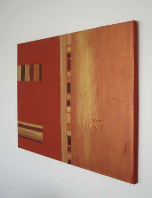 About: A collection of deeply textured and sculptured original abstract paintings, using warm colours with multiple metallic washes and highlights. Each painting has an incredibly deep texture created by hand, that makes you want to reach out and touch it. The artist uses special glues & pastes combined with crushed stones and shells to give the work a three-dimensional and sculptured quality. By artist Caroline Ashwood.