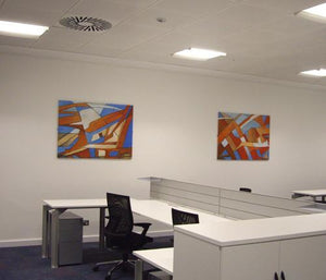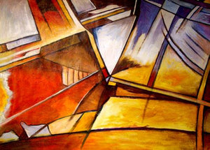 About: A striking collection of original abstract paintings. Each piece is built up with a fascinating montage of shapes and forms, using a palette of warm colours. By artist D Castell.